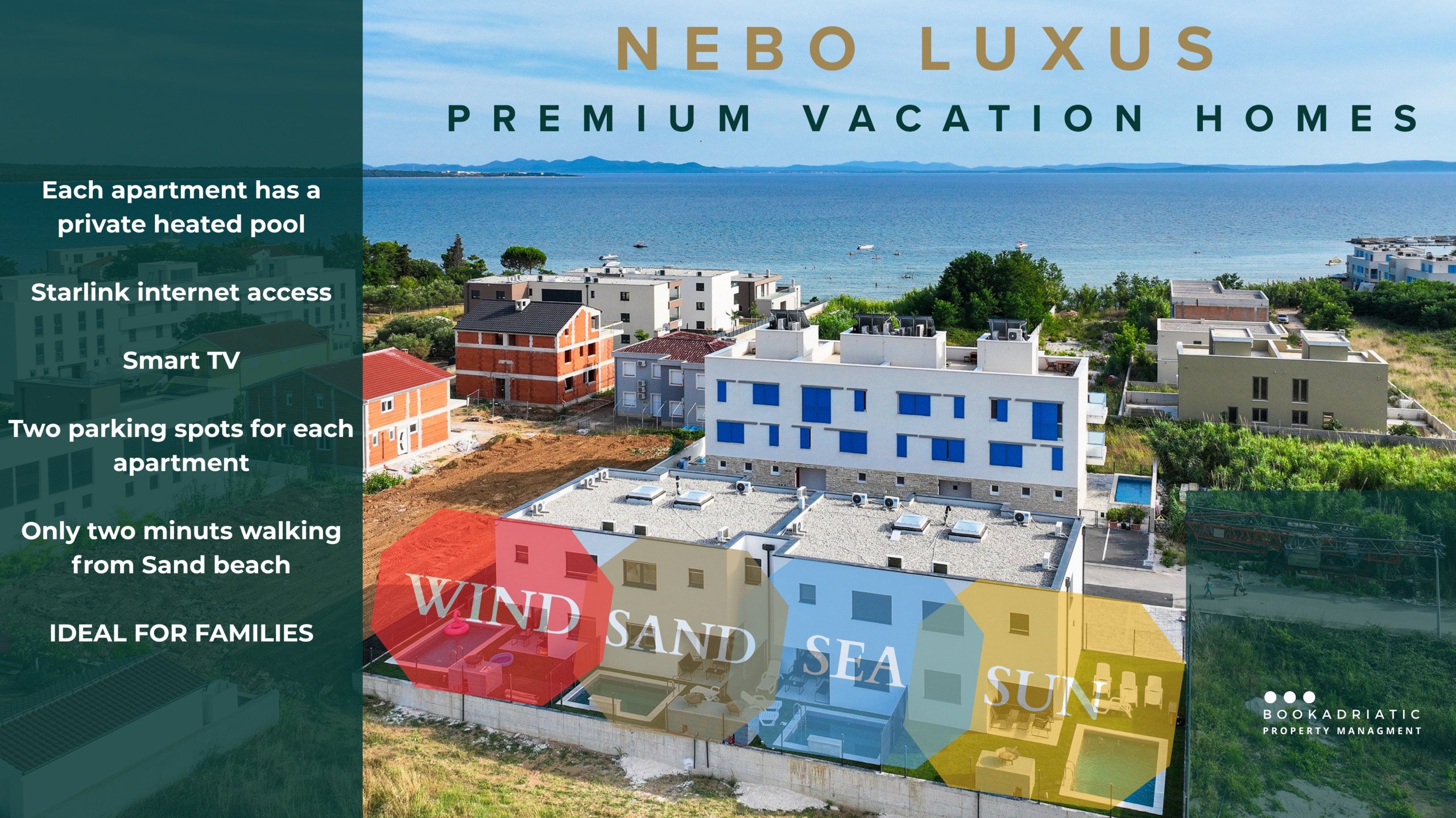 We had an exceptional stay at Nebo Luxus Book Adriatic. The house is brand new, spacious, and perfectly equipped. The heated pool with 24/7 filtration is a true luxury, as is the air conditioning in every living area. The property also offers private parking in a very quiet neighborhood, just five minutes from the beach. The host was incredibly responsive – answering our questions in less than 3 minutes! We felt completely at ease. Everything we needed was available, with top-quality amenities: hotel-level bedding, excellent Wi-Fi coverage, practical mosquito nets, and even a charcoal barbecue for delicious grills. The cleaning team coming every three days was also a huge plus and highly appreciated. We will miss that beautiful place, that quietness and that lovely apartment ! A perfect stay in a house designed with guests’ comfort in mind. Highly recommended!