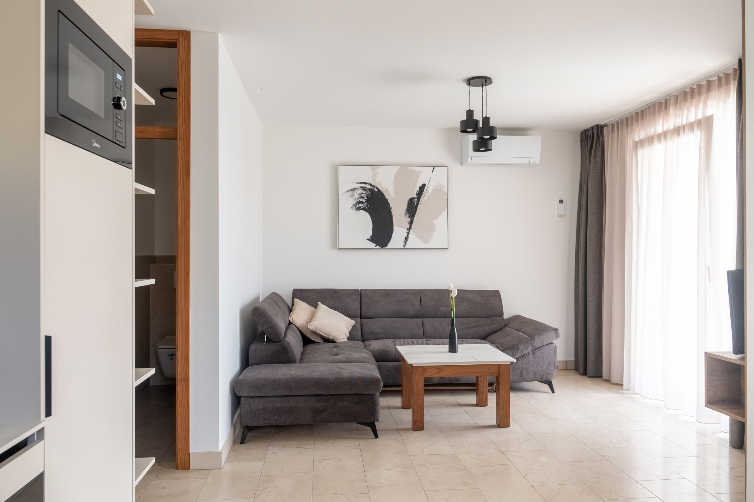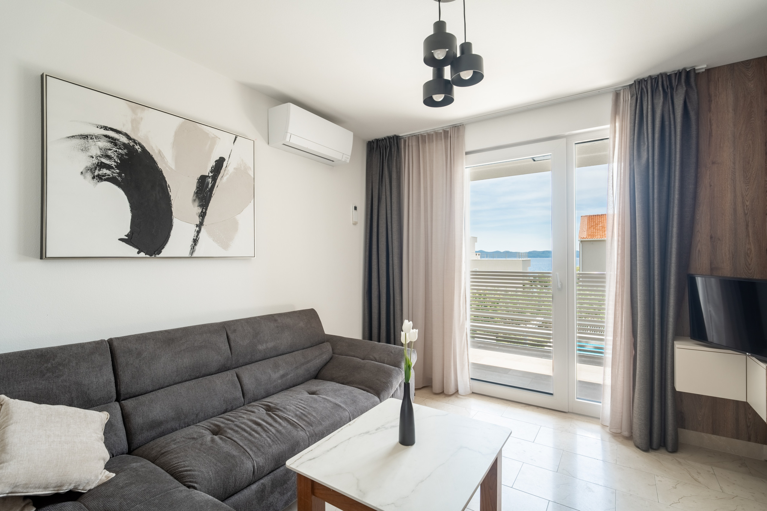 Bright living area with smart TV and minimalist decor